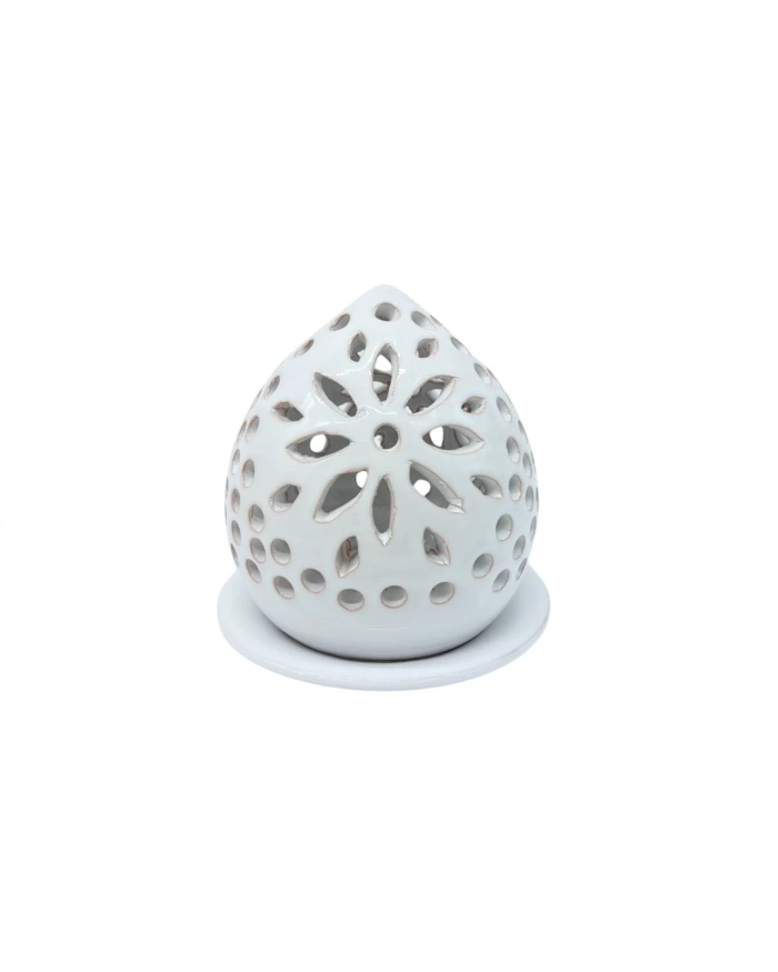 La luce irradiata dalle nostre lanterne regala un’atmosfera magica e piena di incanto. Attraverso i trafori realizzati a mano e per questo sempre diversi, la ceramica disegnerà bellissimi ricami luminosi sulle pareti della tua casa. Lanterna in ceramica con piattino centinato interamente realizzata a mano.