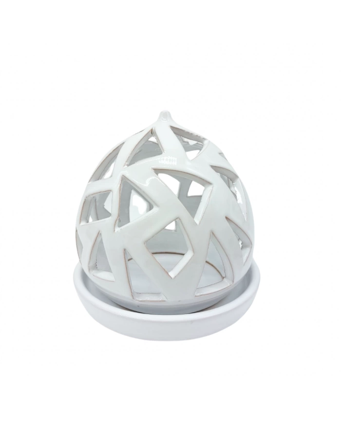 Lanterna Bianca Decoro "Geometrico" Con Piattino H. 14cm in Ceramica