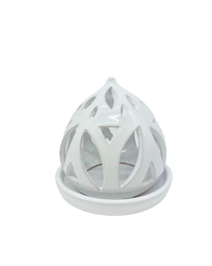 La luce irradiata dalle nostre lanterne regala un’atmosfera magica e piena di incanto. Attraverso i trafori realizzati a mano e per questo sempre diversi, la ceramica disegnerà bellissimi ricami luminosi sulle pareti della tua casa. Lanterna in ceramica con piattino interamente realizzata a mano.