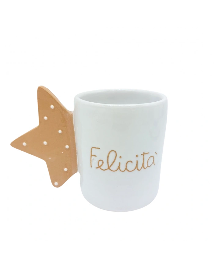 Tazza Mug Bianca Incisione "Felicità" Manico Stella H. 10-11 cm in Ceramica