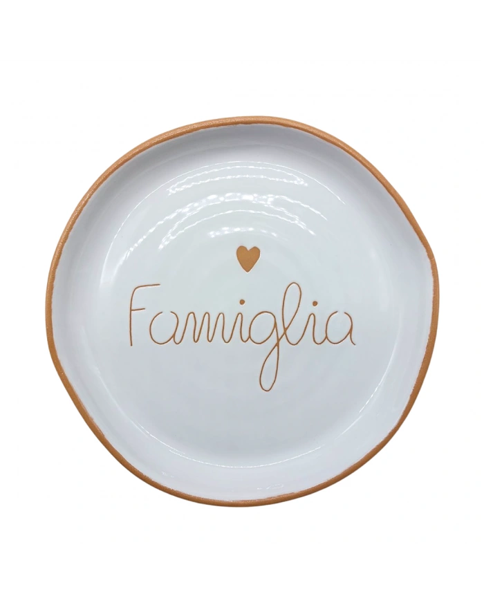 Piatto Bianco Bordo Terracotta Incisione "Famiglia" Decoro Cuore Terracotta Diametro 23 cm in Ceramica